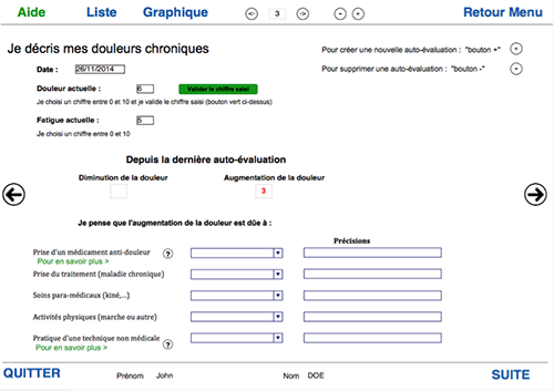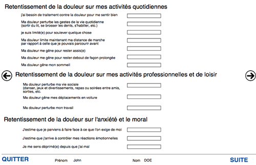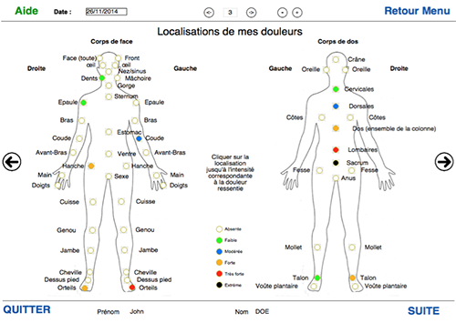 L'utilisateur peut compléter le niveau de douleur ressenti et le niveau de fatigue. Si ce n'est pas la première évaluation il peut visualiser l'augmentation ou la diminution de la douleur depuis la dernière évaluation et en commenter la ou les raisons grâce à des listes déroulantes. Ensuite une carte du corps de face et de dos permet de pointer les zones douloureuses et de matérialiser l'intensité avec des pastilles de couleurs (transparent, vert, bleu, orange, rouge, noir : pour absente, modérée, moyenne, forte, intense, extrême). Ensuite on peut cliquer et envoyer la synthèse par mail au médecin dont on a rempli les coordonnées.
