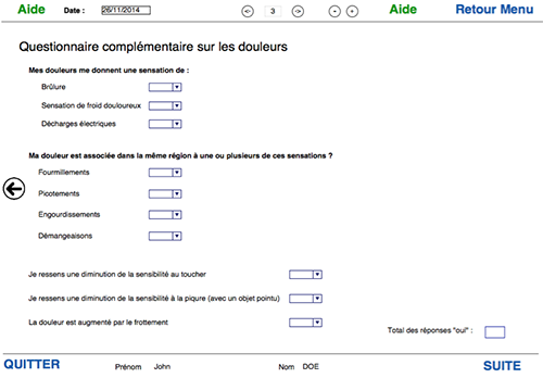L'utilisateur peut, en plus, mettre des mots sur ses douleurs pour en préciser le type et l'intensité par exemple : "fourmillement - intense" à l'aide de menus déroulants qui ont été conçus à cet effet .. Si des réponses peuvent s'appliquer à des douleurs neuropathiques, il est proposé à l'utilisateur (s'il le souhaite) de répondre à un questionnaire complémentaire
